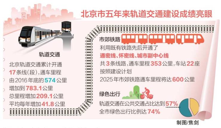 过去五年,北京轨道交通累计开通17条线(段),209.1公里;累计开工线路5条(段),53.9公里,服务范围不断扩大,服务效能明显提升。一座座车站,一条条线路,正串起每个市民的日常生活。