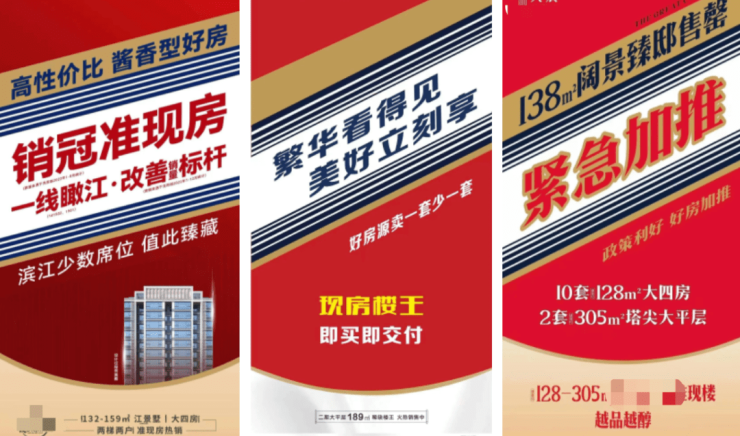 连日来,《每日经济新闻》记者注意到,在酱香拿铁火爆出圈后,多地售楼处也纷纷喊出“紧急加推,来看房,免费赠饮!”“酱香or真香,不如现房香”等口号。营销中心的设计推广团队连夜加班,争相模仿茅台酒的包装设计,创意性地加入公司项目的户型、位置和联系方式等信息,房地产海报界俨然刮起了一阵“茅台”风。