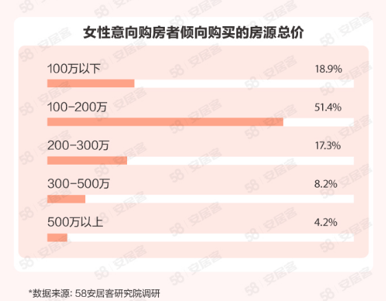 房屋总价方面,多数女性倾向购买总价在100万-200万元的房源,占比为51.4%;此外,18.9%的女性倾向购买100万元以下的房子,17.3%的女性计划购买200万-300万元的房子。