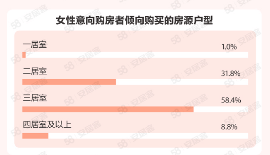 对所有购房者而言,户型都是需要重点考虑的因素之一。报告显示,在女性购房者中,倾向购买三居室的占比最高,达58.4%,其次有31.8%的女性选择购买两居室,分别仅有8.8%和1%的女性准备购买四居室和一居室。
