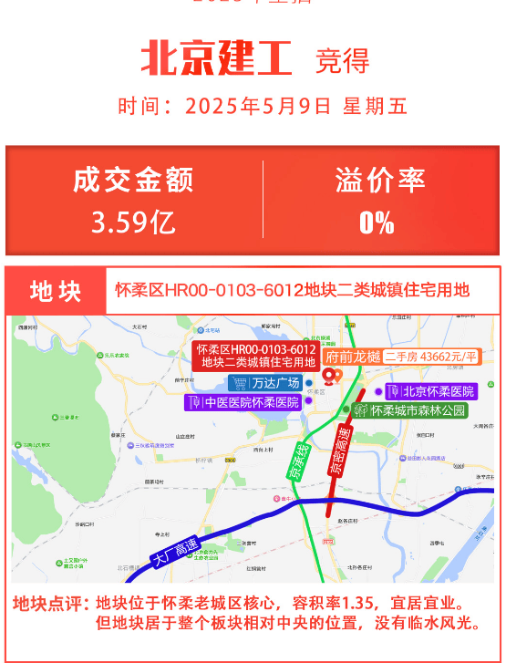 最后上周京楼市场再成交一宗新地,建工以3.59亿底价拿下了怀柔地块楼面价约为1.65万