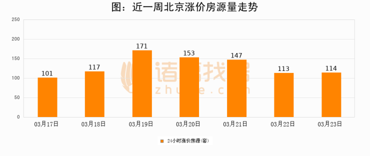 根据诸葛找房数据显示,北京24小时涨价房源量为114套,较03月22日增加1套,环比上涨0.9%。与此同时,涨价房源占比小幅扩大,业主信心有所提升。