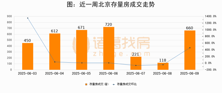 从存量房来看,2025年06月09日北京存量房单日成交660套,比昨日增加542套,环比上涨459.3%。从近一周存量房成交来看,北京存量房日均成交套数为493套,06月09日单日成交660套,高于近一周平均水平33.9%。
