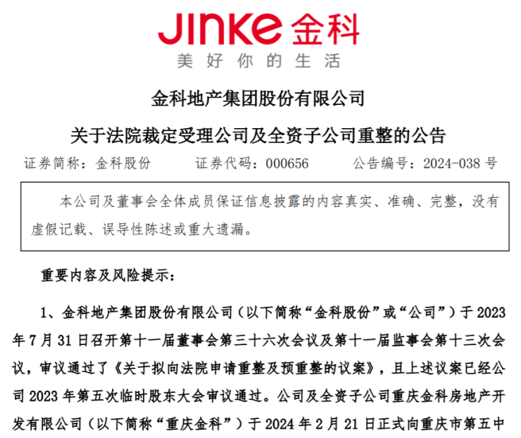 公告显示,今年2月21日,申请人金科股份以其不能清偿到期债务,并且明显缺乏清偿能力为由,向法院申请破产重整。法院于4月10日组织召开听证会,参加听证的大部分债权人表示支持金科股份重整。