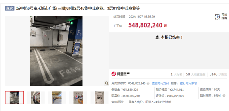 11月28日,据阿里资产拍卖网披露的信息显示,福建省福州市晋安区新店镇坂中路6号泰禾城市广场(三期)6#楼2层45集中式商业、3层01集中式商业等标的物已被拍卖,成交价为拍卖起始价,约5.488亿元。