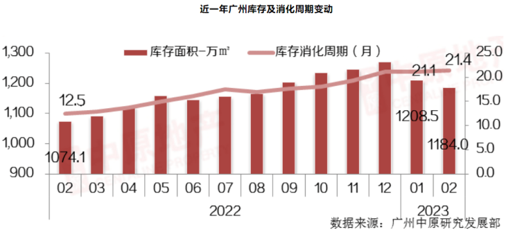 今年由于春节比去年更早,节后的回暖来得也更早。据广州中原研究发展部数据,截至2月末,广州全市新房库存量1184万平方米,去化周期21.4个月。由于成交并未有出现“立竿见影”式的增值,因此去化周期基本与过去2个月持平。