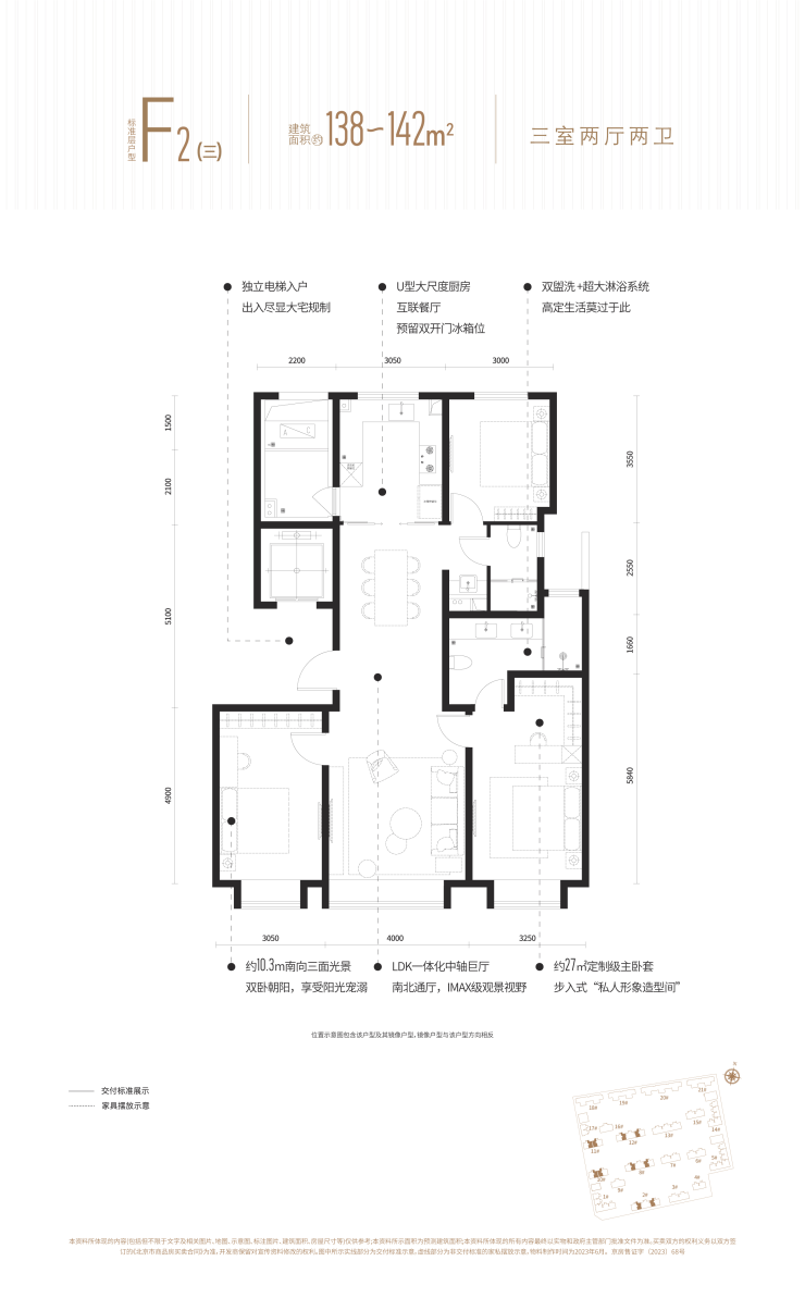 建面约140平的三室两厅两卫,约10.3m南向三面光景,LDK一体化+U型大尺度厨房,主卧套房设计还带衣帽间,高定生活莫过于此。