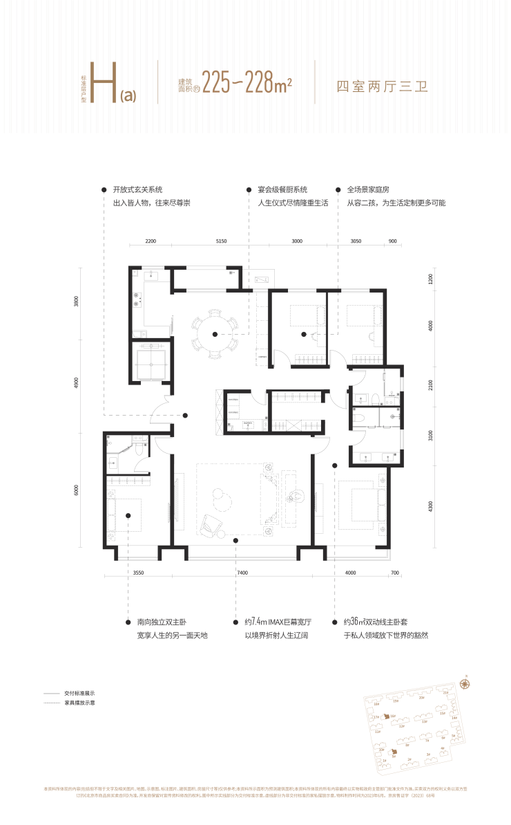 建面约225㎡的四室两厅三卫,同样是三面朝南的格局,该户型配有约7.4mIMAX巨幕宽厅,可尽情沐浴阳光;开放式玄关,宴会级餐厨系统,还有36㎡双动线主卧套,尽显主人尊贵身份。