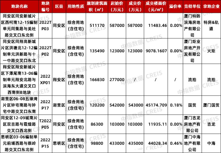 同安区3幅底价成交的地块分别由厦门炬业房地产开发有限公司以12.3亿元拍得同翔高新城片区洪塘北地块,楼面价9000元/平方米;厦门古龙房地产有限公司以10.3亿元拍得城南片区地块,楼面价1.2万元/平方米;厦门特房滨海房地产有限公司以58.7亿元拍得同安新城片区地块,楼面价1.5万元/平方米。