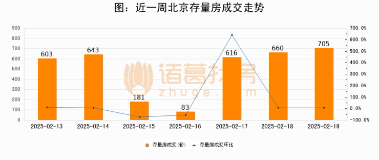 从存量房来看,2025年02月19日北京存量房单日成交705套,比昨日增加45套,环比上涨6.8%。从近一周存量房成交来看,北京存量房日均成交套数为498套,02月19日单日成交705套,高于近一周平均水平41.6%。