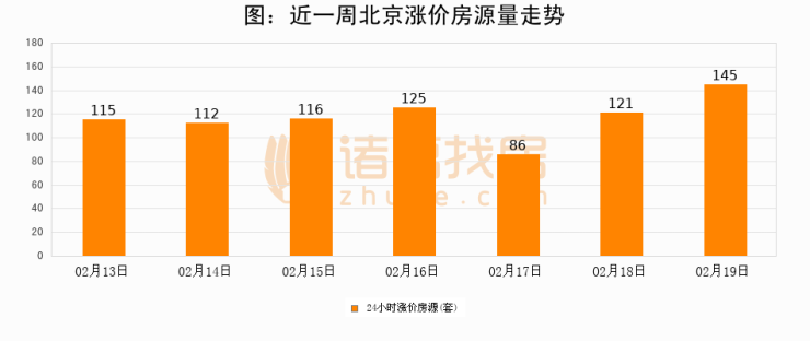 根据诸葛找房数据显示,北京24小时涨价房源量为145套,较02月18日增加24套,环比上涨19.8%。与此同时,涨价房源占比小幅扩大,业主信心有所提升。