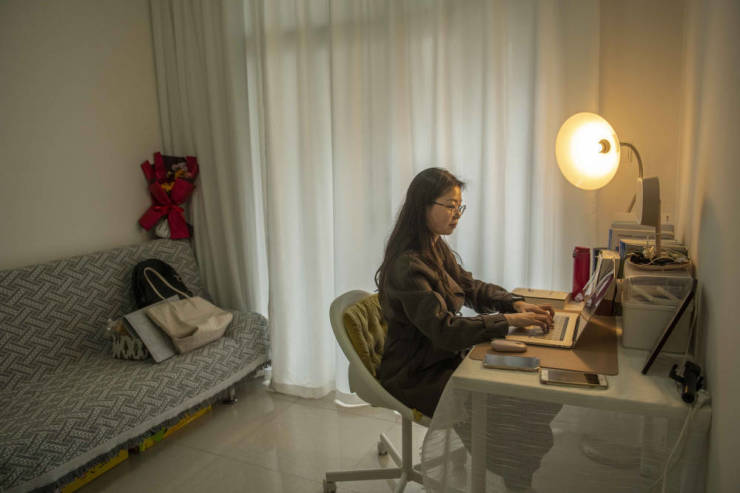 ▲2022年2月9日,沙坪坝区保障性租赁住房项目五云佳苑,尹姮正在家里办公。她租的两室一厅约60平方米,每月租金600元左右。记者 张锦辉 摄/视觉重庆