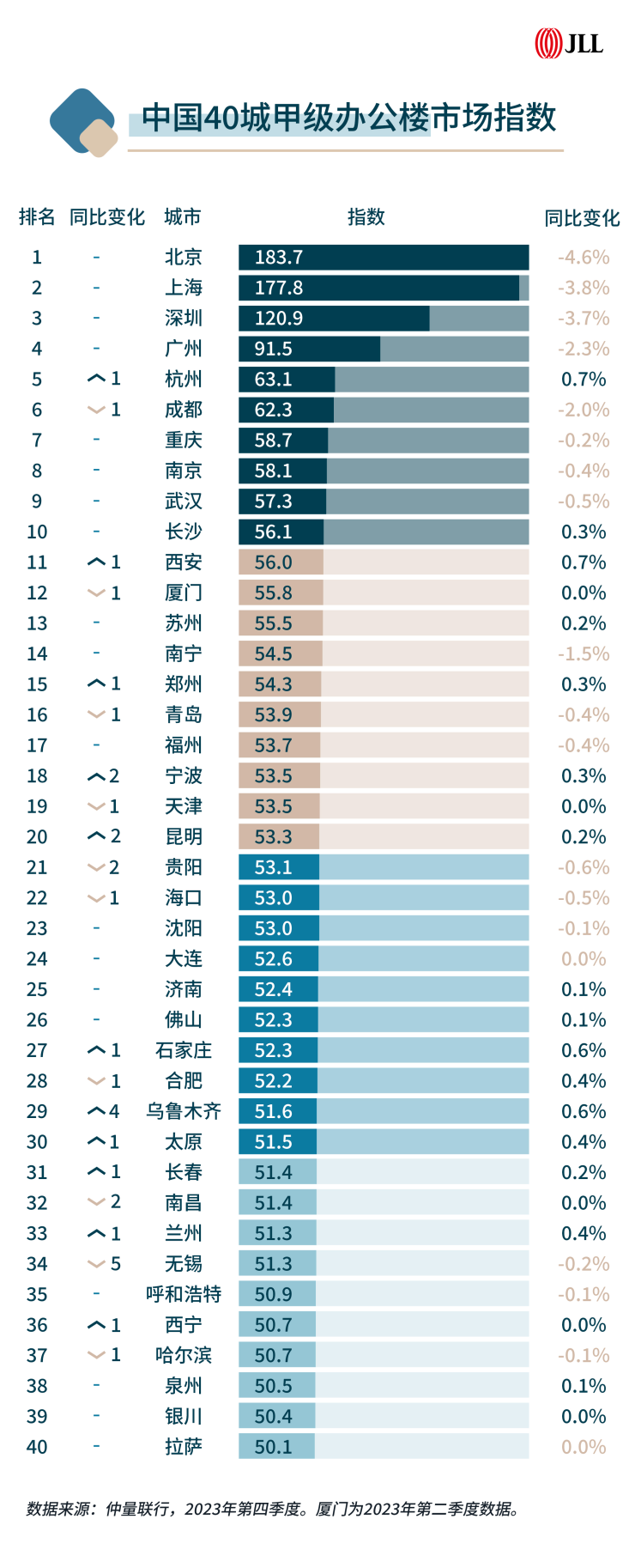 仲量联行从全国200余座城市中选取了政治经济综合影响力前40城市,就其办公楼市场进行比较,发布了2023年度“中国40城办公楼市场指数”。