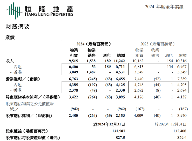 2024年,恒隆集团及恒隆地产的总收入分别增长8%及9%至117.60亿港元及112.42亿港元,包括物业销售收入15.38亿港元;股东应占基本纯利分别减少21%及25%至23.27亿港元及30.95亿港元,部分原因是内地及香港物业销售市场环境受压,若干发展项目作出拨备。