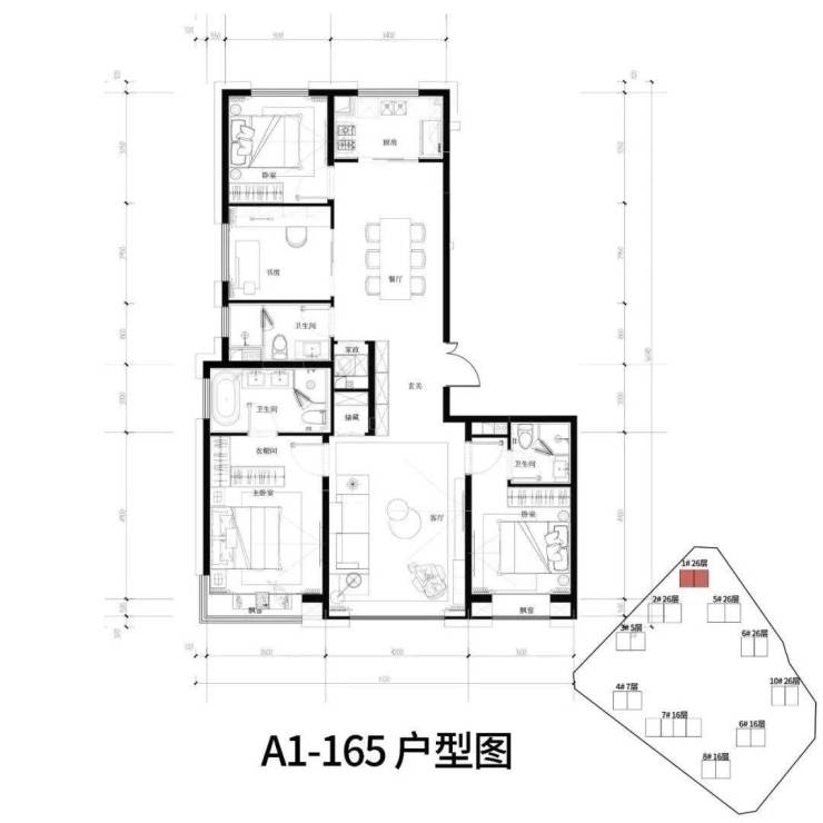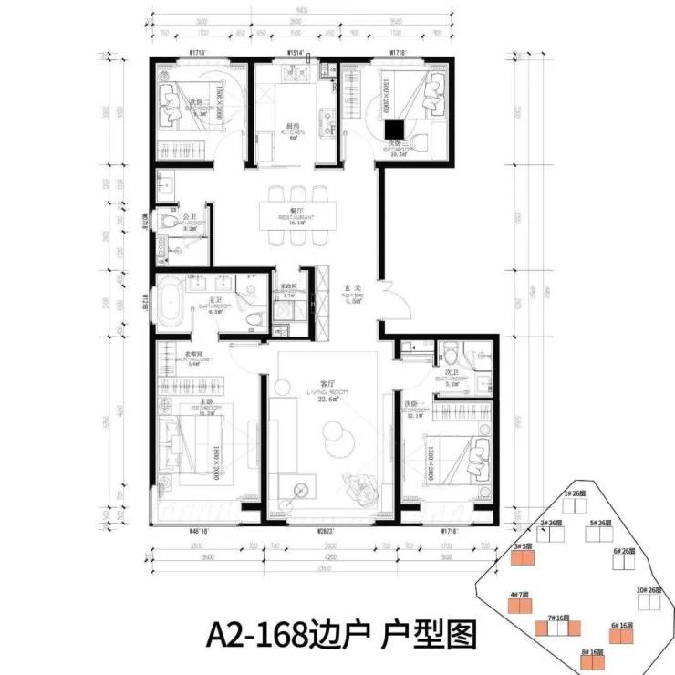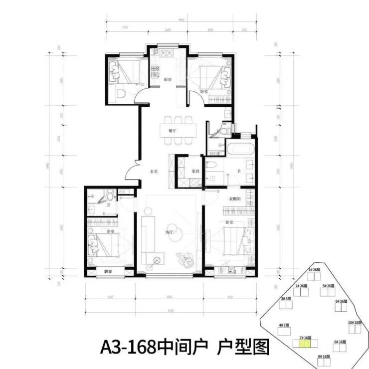 建面约168㎡四居边户,这个户型是主力房源数量较多。