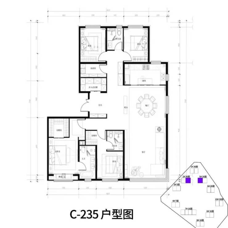 项目约412套房源,主力户型面积段是165/168㎡、196㎡、235㎡,户型图如下。