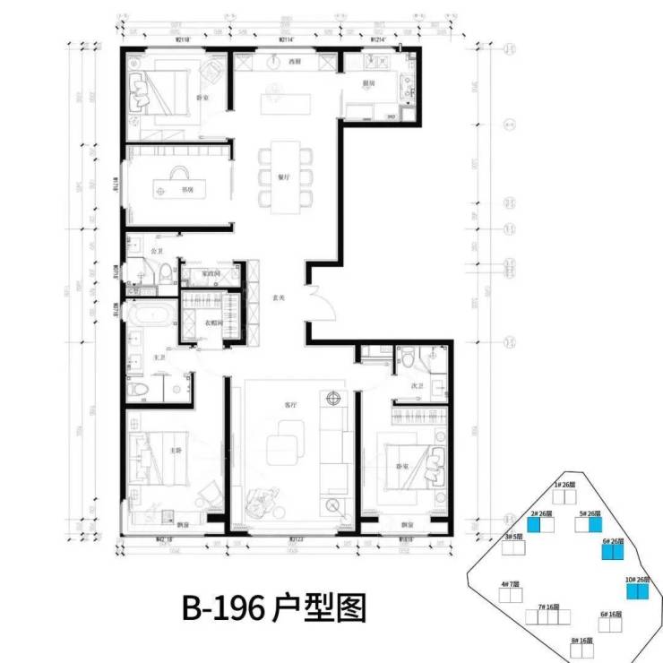 建面约196㎡四居,主力户型之一。南向三面宽11.3米,客厅面宽4.5米,整体布局和前两种户型没有太大改变。