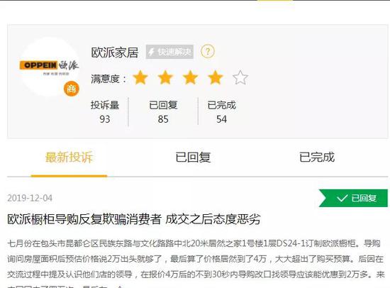 时间财经查阅发现,在黑猫投诉平台,欧派家居投诉量达93条,主要问题包括产品质量、甲醛异味、售后等。