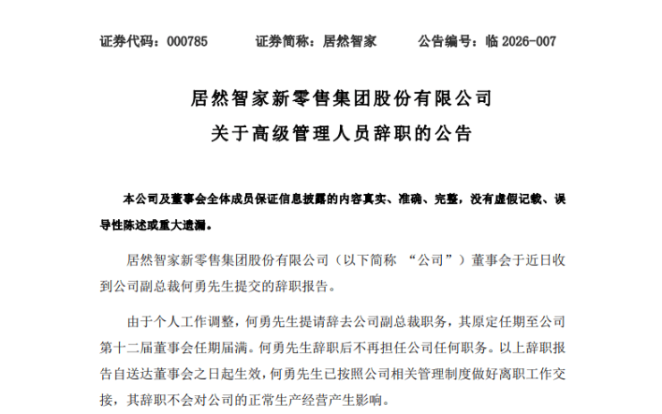 2026年3月2日,居然智家(000785.SZ)发布公告称,公司副总裁何勇先生因个人工作调整,已向董事会提交辞职报告,辞去副总裁职务。辞职后,何勇先生将不再担任公司任何职务。其辞职自送达董事会之日起生效,且不会对公司的正常生产经营产生影响。