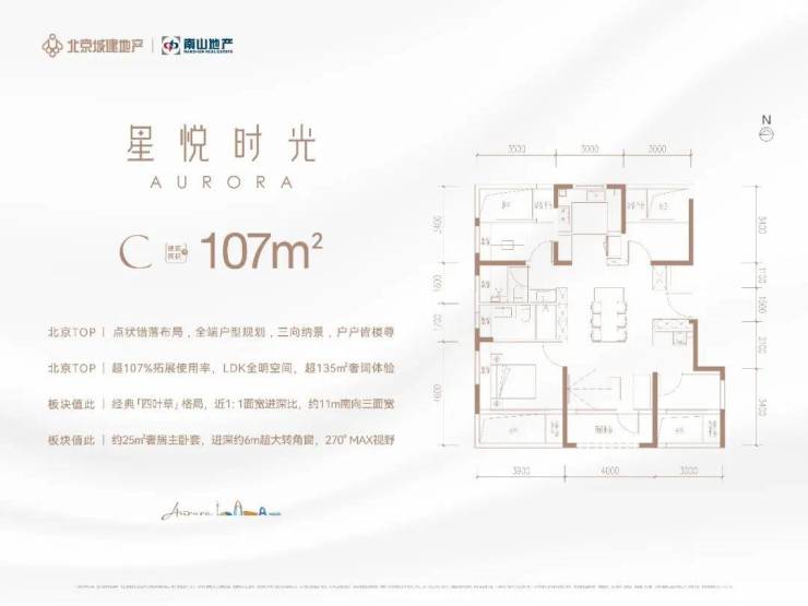约107㎡的「四叶草」户型,堪称收藏级的存在——它不仅是板块内唯一在售的四叶草格局大四居,更是以全端户设计,让家家户户都坐享楼尊视野。