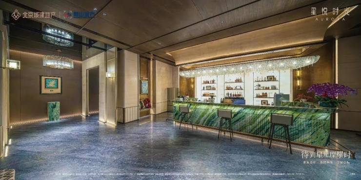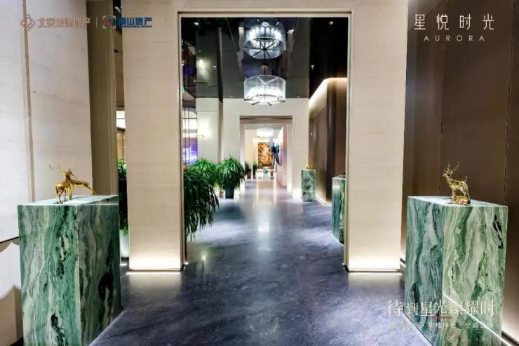 约60米展宽的社区大门以普拉达绿奢石点睛,踏入门庭,6.65米挑高空间骤然撑开视野。顶部星芒阵列倾泻光瀑,香格里拉石材在墙面拼出潮白河蜿蜒曲线——设计师刻意保留石材原生裂隙,让水流肌理更具野性生命力。地面古巴黑石铺就的波浪纹,在射灯下泛出金属冷光,每一步都似踏在“步步生潮”的预言上。