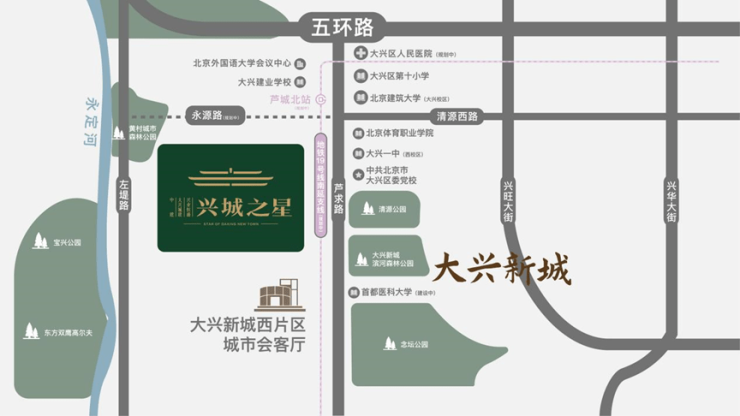 兴城之星踞守的大兴新城西片区,作为大兴新城未来的后花园,定位为文教先导综合发展区,是教育科研中心、文体中心、重要居住片区。西接永定河生态走廊,东观清源公园、念坛公园(近万亩大兴滨河森林公园组成部分),北瞰5508亩城市森林公园,一河三园鲜氧绿境,尽享舒适与惬意。