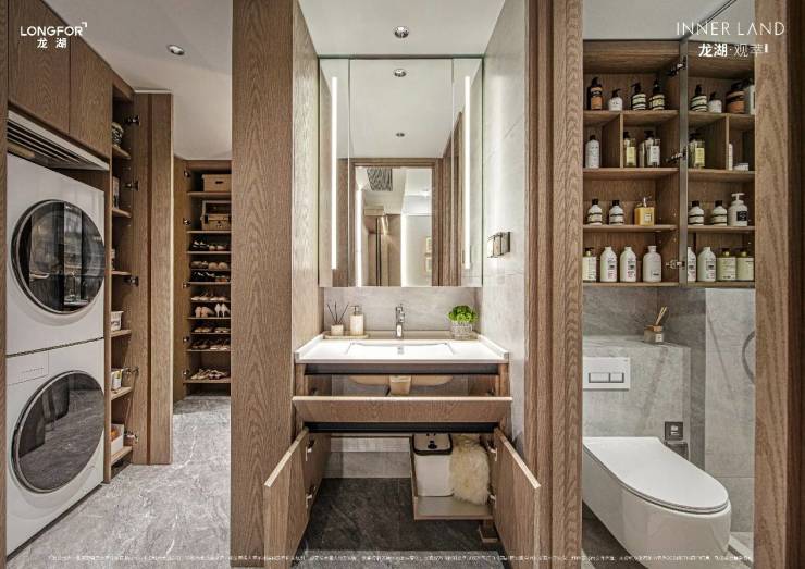 龙湖·观萃独创「SPACE+」收纳理念,基于玄关、客厅、厨房等五大功能区,全屋定制超20组隐藏式柜体,至高约18300L收纳空间,释放出海量储物空间,较常规住宅收纳效率提升约30%。确保每一处收纳空间“物尽其放,放皆有序”,让家变得“可持续生长”。