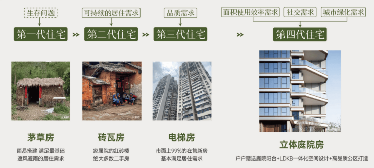 相较于仅能满足遮风阻雨的第一代茅草屋,家属院第二代砖瓦房,以及钢筋混凝土的“鸟笼式”第三代电梯房,第四代住宅的优势非常明显: