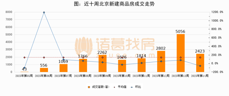 进入2025年第14周(03月31日-04月06日),北京新建商品房成交2423套,较上周减少2633套,环比下降52.1%。从近十周成交来看,周均成交套数为1941套,本周成交2423套,高于近十周平均成交量24.8%。