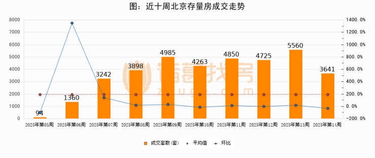 存量房方面,第14周北京存量房成交3641套,较上周减少1919套,环比下降34.5%。从近十周成交走势来看,周均成交套数为3661套,本周低于平均水平0.5%。