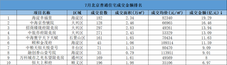 先说普宅,单盘来看,7月北京普宅成交套数前10的项目仅有3个限竞房项目。海淀区的海淀幸福里以19.29亿、182套的成绩仍稳居销冠宝座;大兴区的中海京叁號院以16.46亿、128套次居第二;同样位于大兴区的招商臻龙府限竞房位列第三,成交金额为13.94亿、297套。