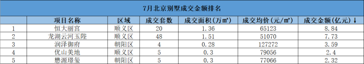 再看别墅市场,顺义区恒大丽宫以8.84亿、20套的成绩成为7月北京别墅市场销冠;顺义的龙湖玉陛、朝阳的润泽御府分别以7.73亿、3.59亿位居二三。