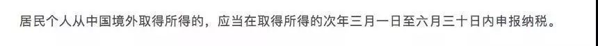 需要注意的是,居民个人从中国境外取得所得的,应当在取得所得的次年3月1日至6月30日内申报纳税。