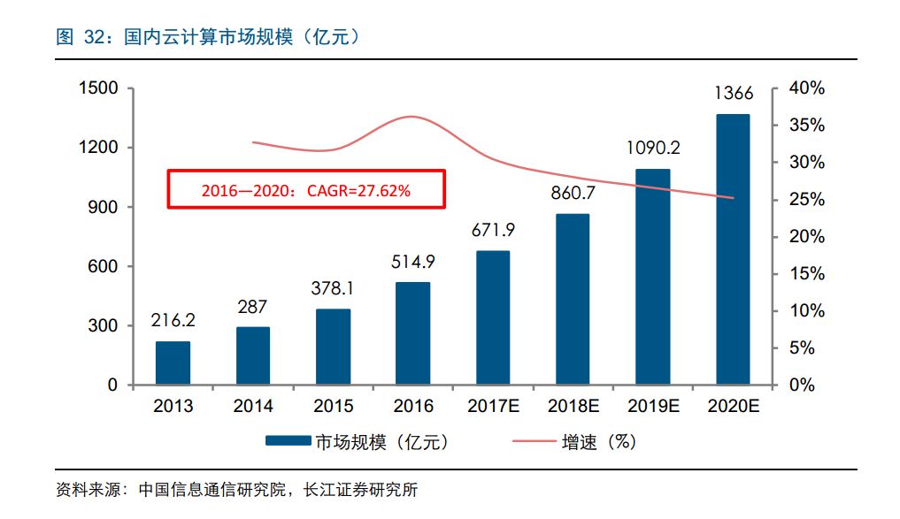 国内云计算市场持续高速发展态势。2016 年,国内云计算市场规模高达 514.9 亿元,同比增长 36.18%。到 2020 年,国内云计算市场有望达到 1366 亿元,2016—2020 年的年均复合增长率有望达到 27.62%,高于全球市场 5.95 个百分点。