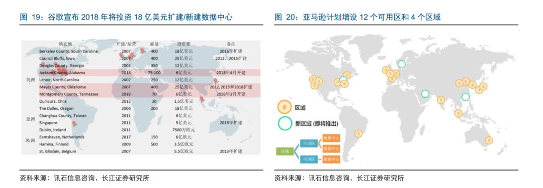 北美厂商布局全球数据中心:谷歌、亚马逊、Facebook、微软和苹果等北美重要数据中心巨头纷纷在数据中心领域投入巨资进行布局。其中,谷歌目前在全球已有 15 个数据中心,2018 年预计计划投入 18 亿美元扩建/新建数据中心;亚马逊宣布计划增加巴林、中国香港特别行政区、瑞典和美国第二个 AWS GovCloud 四个数据中心区域,同时增加 12 个可用区,每个可用区由一个或多个分散的数据中心组成。