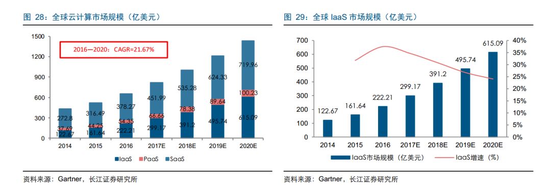 SaaS 的市场规模较大,IaaS 的增速较快。从市场规模看,2016 年 SaaS 的市场规模较大,高达 378 亿美元,超过 IaaS 和 PaaS 两者之和。从市场增速看,2016 年 IaaS的市场增速高达 37.47%。根据 Gartner 预测,从 2016—2020 年 IaaS 市场规模的年均复合增长率有望达到 28.99%,高于全球云计算市场的整体增速。