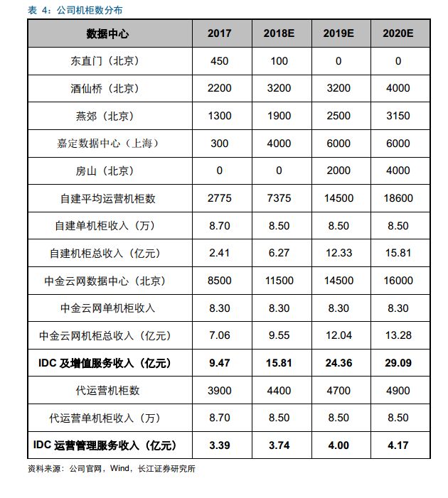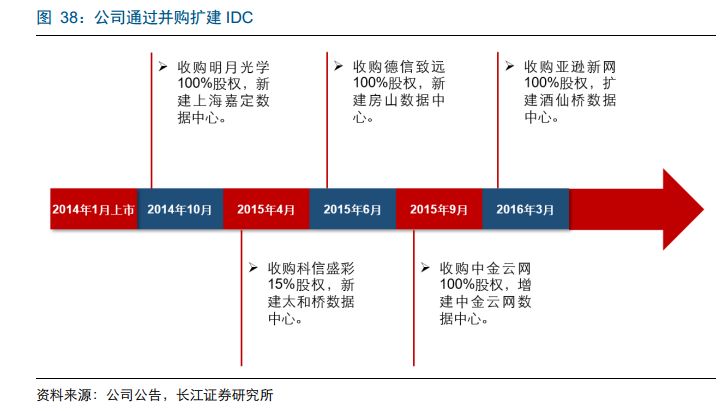 自 2014 年上市后,公司通过扩容和外延并购的方式大规模新建数据中心,助力公司持续享受 IDC 服务市场高增长。截止 2017 年底,公司拥有八大数据中心,其中酒仙桥、燕郊、东直门、上海嘉定、房山共 5 个为数据中心,与 KDDI 共建亦庄数据中心,收购中金云网数据中心,收购科信盛彩新建太和桥数据中心。
