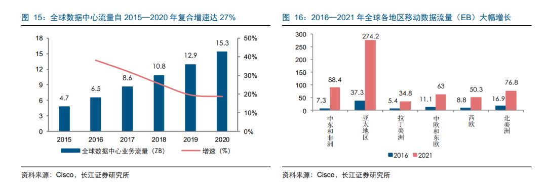 数据流量增长呈加速态势,且随着物联网、大数据等应用的发展,数据存储和计算逐渐向数据中心转移,“东西向流”流量占比快速提升。根据 Cisco 预计,全球数据中心业务流量将从 2015 年的 4.7ZB 增长至 2020 年的 15.3ZB,复合增长率高达 27%。从全球范围看,Cisco 公布的全球移动数据流量预测(2016-2021 年)表明,全球各地区移动数据流量将大幅增长有望增长 5-12 倍左右。其中,亚太、中东与非洲等地区成为流量增长主要区域。