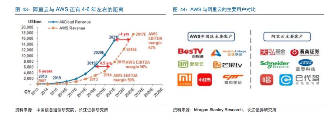 整体来看,AWS 的客户更注重 AWS 提供的先进技术与技能,而对价格相对不敏感。根据 Morgan Stanley Research 预测,阿里云在技术与性能上平均与 AWS 相差 4-6 年左右。我们认为,在今后相当长的一段时间内,阿里云将更多地面向规模较小的客户企业,而 AWS 所提供的高端技术与高质量服务依旧对高端客户具有较强吸引力。两者的目标客户群体不同,在国内的竞争格局趋向于各有所长。