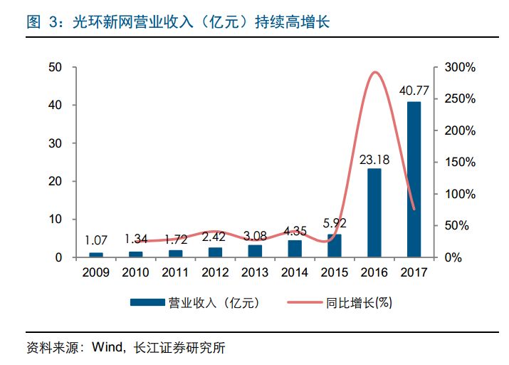 2017 年少有科技的营业收入为 13.40 亿元,同比增长 82%,占 2017 年光环新网总营收的近 1/3。业绩方面,2015—2017 年少有科技扣非后的归母净利润分别达到 3,608万元、4,840 万元和 8,446 万元,均高于业绩承诺利润金额,2015—2017 年归母净利润年均复合增长率高达 53.00%。我们预计,2018 年少有科技的营收与业绩有望持续高增长,营业收入有望实现翻倍增长。
