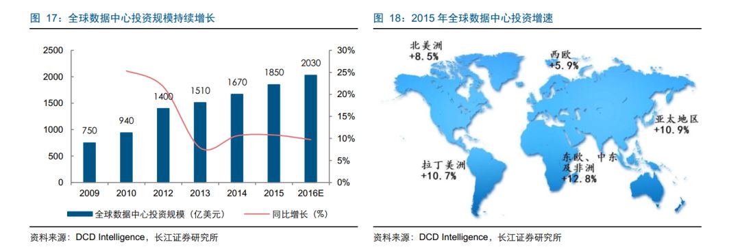 北美市场持续高增长:随着大数据时代的来临,以 Google、百度等互联网公司为代表的 ICP 企业数据中心建设在全球范围内兴起。IDC 的预测表明,全球数据中心数量将于2017 年达到 860 万个。北美特别是美国占据全球近一半的数据中心,成为过去几年数据中心市场增长的主要驱动力。从全球 IDC 投资市场看,数据中心投资同样保持着稳定的增长态势。从投资增速看,西欧、北美等传统数据中心市场趋于饱和状态,增速相对疲软;亚非拉等区域成为数据中心增长较快的市场,中国、印度等新兴市场的数据中心投资增速比较突出,这主要源于 IT 企业、互联网企业和电信企业的业务支撑和拓展。