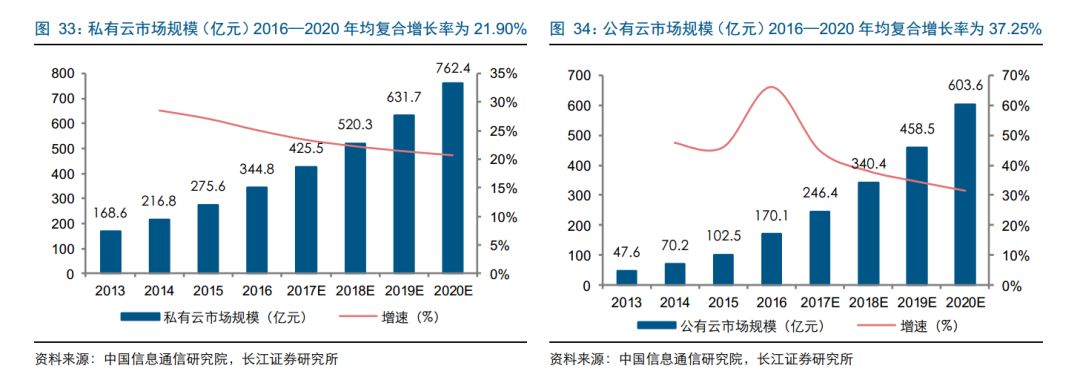 从市场规模看,2016 年国内私有云市场规模为 344.8 亿元,同比增长 25.11%;公有云市场规模为 170.1 亿元,同比增长 65.95%,私有云市场规模约为公有云的 2 倍。从增长趋势看,公有云市场规模增长更快,2016—2020 年私有云的年均复合增长率为21.90%,而公有云的年均复合增长率高达 37.25%,显著高于私有云市场增速。2020年,公有云市场规模有望达到 603.6 亿元。