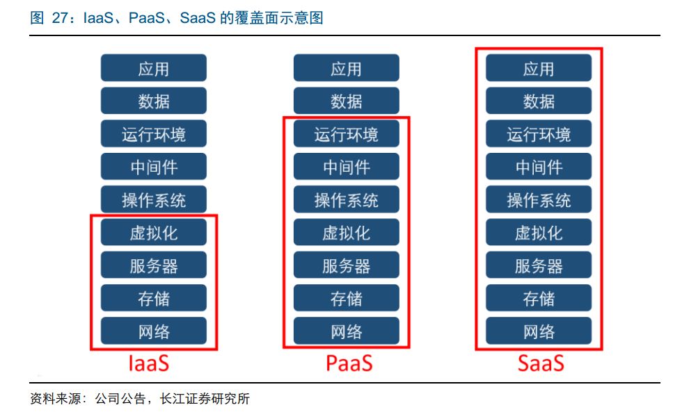 从云计算的细分市场看,主要有 IaaS、PaaS 和 SaaS。其中,IaaS 是基础层、PaaS是平台层、SaaS 是软件层。