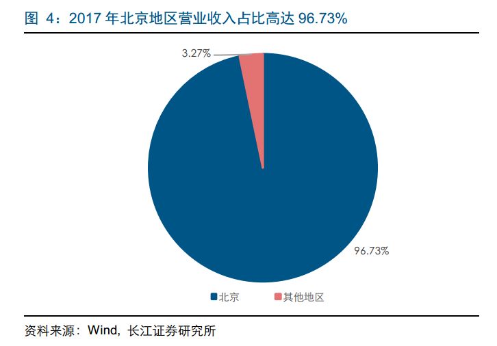 从收入的区域结构来看,公司掌握北京地区核心 IDC 资源(其中包括 7 个北京的数据中心),主营业务以北京地区为主。2017 年,公司在北京地区营收占比高达 96.73%。伴随上海嘉定绿色数据中心的投产,公司的业务区域将形成以北京为中心,向全国各地逐步发展的格局。