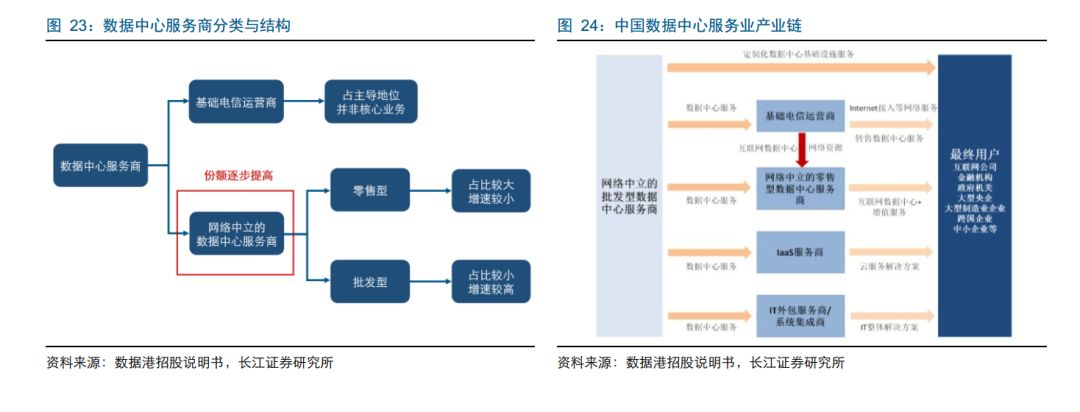 国内数据中心服务业产业链主要分为:基础电信运营商和网络中立的数据中心服务提供商(即第三方 IDC 服务商)。基础电信运营商(中国电信、中国联通和中国移动)主要向零售型数据中心服务商及较终用户提供数据中心机房和带宽资源;第三方 IDC 服务商通过数据中心或者租用基础电信运营商的数据中心为客户提供数据中心服务。其中第三方 IDC 服务商主要分为:零售型 IDC 服务商与批发型 IDC 服务商。零售型服务商通过 IDC 或租用基础电信运营商的机柜为客户提供服务;批发型服务商主要为少数大型客户定制化设计、建设和运营大型数据中心。从目前的格局看: