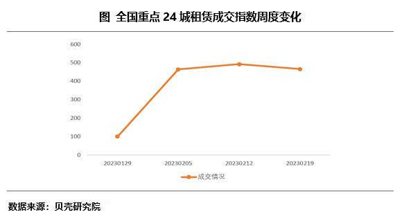 另据贝壳研究院数据,春节后全国重点24城租赁成交量呈现显著提升,24城春节后三周的平均周度成交量较春节假期一周的成交量提升了近4倍,与去年的市场热度基本持平。