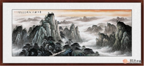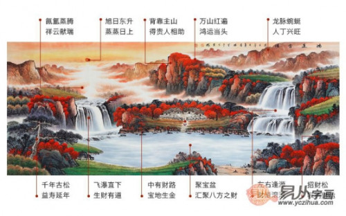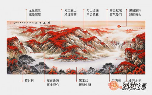 鸿运题材的风水画以红色元素为主,都知道红色在中国代表的是喜庆、吉祥的寓意,运用在山水画中结合灵山秀水则更显美好象征