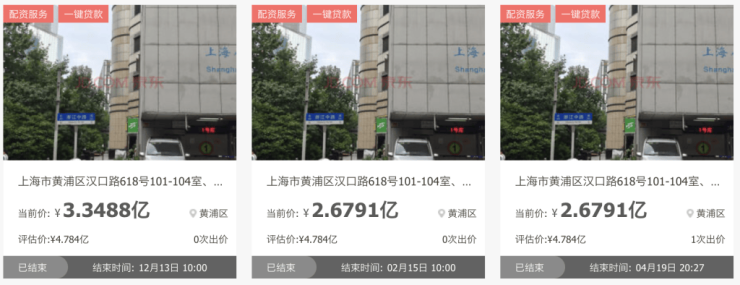 公开信息显示,今年第二季度包括普陀区光新路永乐项目、黄浦区湖北路中福古玩城、闵行区中谊路商铺、黄浦区汉口路618号中福大厦等项目都通过法拍交易。澎湃新闻(www.thepaper.cn)查阅发现,这些项目不仅经过多轮拍卖,最终成交价较评估价和首次出价都有不少折价。