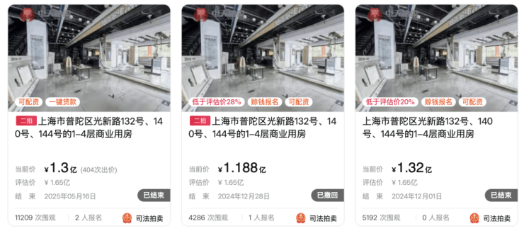 而位于普陀区光新路永乐项目经历了一次流拍、一次撤回,同样于第三次拍卖成交。公开资料显示,普陀区光新路永乐项目为上海市普陀区光新路132号、140号、144号的1-4层商业用房,标的所有人是永乐(中国)电器销售有限公司,建筑总面积约8749.74平方米,评估价约1.65亿元。该项目于去年12月1日首次拍卖,首轮拍卖价格约1.32亿元,0人报名。去年12月28日,该项目二次拍卖,价格挂1.188亿元,拍卖网站信息显示因“程序上有瑕疵”而撤回。