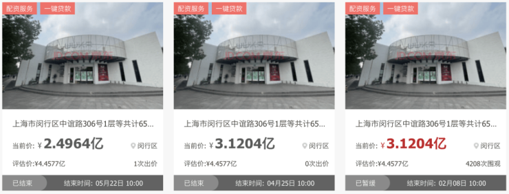 位于闵行区中谊路306号1层的65套商业房产也是如此。该项目建筑面积合计约9438.23平方米,房屋类型为店铺,评估价约4.46亿元,首次起拍价约3.12亿元。该项目于今年2月8日首次拍卖,同样流拍两次,最终于今年5月22日成交,最终成交价约2.5亿元,较评估价折价约44%、较首次起拍价折价约20%。